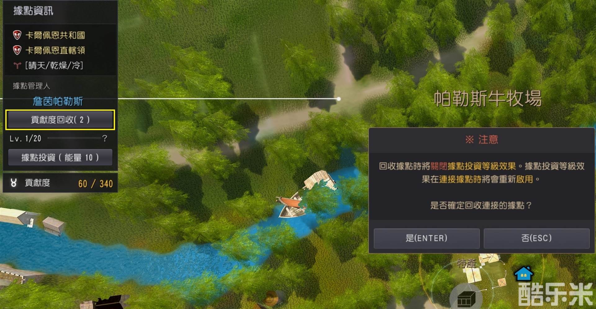 打开世界地图后点击想回收投资的据点,再点击“回收投资”按钮,即可取回贡献度。但如果有与该据点连接的据点,就无法进行回收的动作。