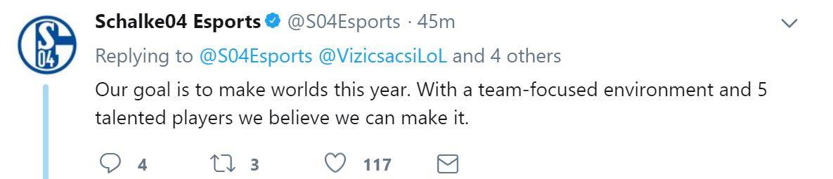 随后不久,沙尔克04在推特公布了队伍新赛季的目标:“我们今年的目标是去世界赛。我们有着一个良好的队伍氛围,五位出色的有才华的选手,我相信我们可以做到。”