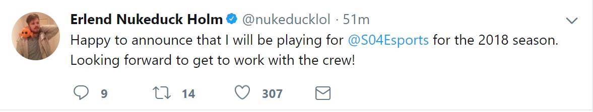 中单Nukeduck:很开心通知大家我将在新赛季和沙尔克04一起奋斗。我期待和队友合作愉快!