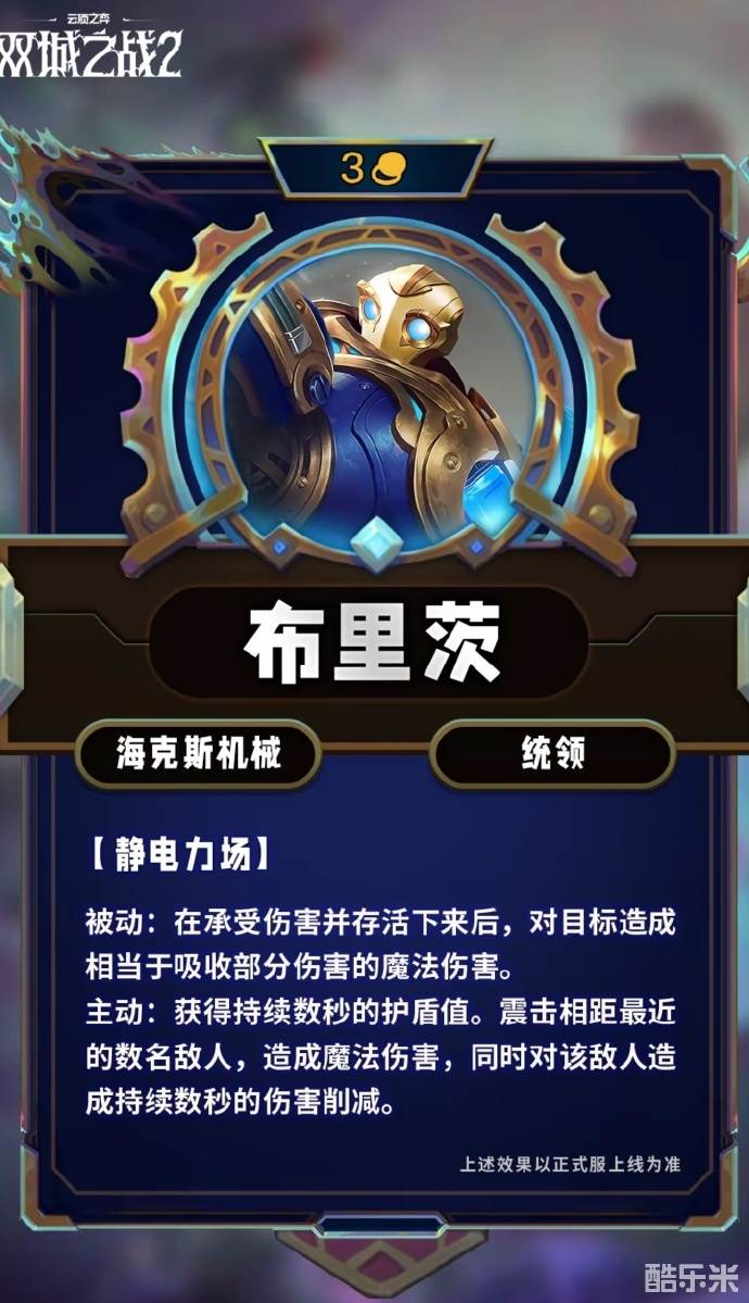 云顶之弈S13快上线了,新赛季的主题是双城之战2,新增了很多新的棋子,比如布里茨,那么云顶之弈S13布里茨技能是什么?下面酷乐米小编给大家带来云顶之弈S13布里茨技能效果一览。