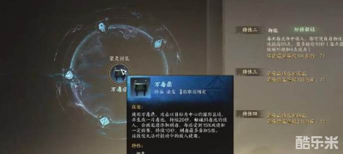 万毒鼎是一个远程法宝,可以给别人叠一个毒,然后也是个范围伤害,在一些团战场景有不错效果,但是在1V1和3V3中表现都不太行。