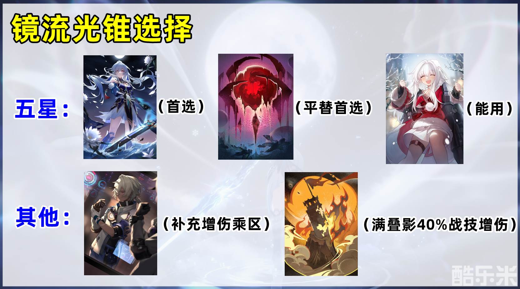 再往下的话,只推荐四星光锥秘密誓心和三星光锥天倾。秘密誓心能补足镜流需要的增伤乘区;而天倾虽然面板攻击力低点,但是满叠影可以提供40%战技增伤,可用于过渡。