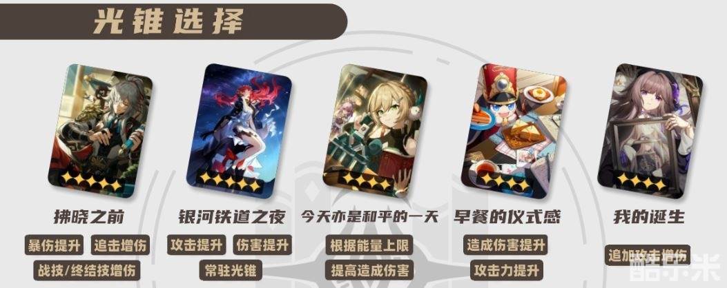 【光锥选择】光锥优选「拂晓之前」,光锥技能提供了高额暴击伤害、技能伤害加成;其次考虑「银河铁道之夜」(偏对群);4星光锥优选「今天亦是和平的一日」(根据能量上限提高造成伤害),其次考虑「早餐的仪式感」(消灭敌人攻击提升)、「天才们的休憩」(消灭敌人后暴伤提升)、「我的诞生」(追击增伤)。