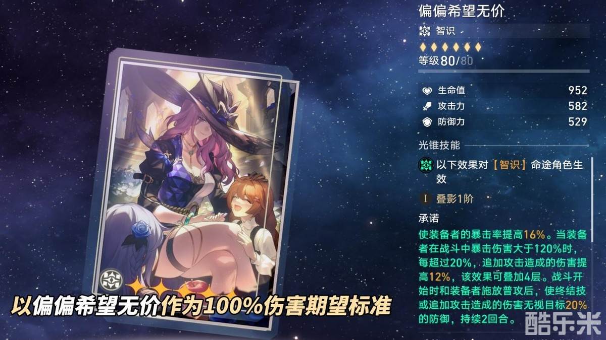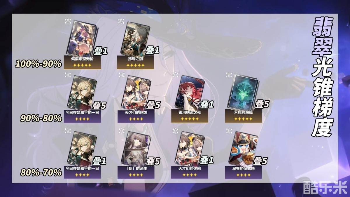 【光锥伤害期望梯度】这期将以翡翠专武‘偏偏希望无价’作为100%期望标准,给出光锥梯度,大家依照自身情况挑选最佳的即可~
