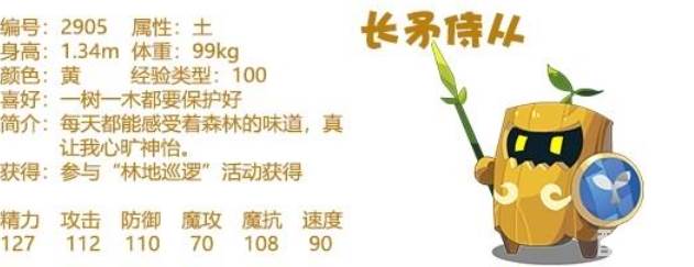 长矛侍从,编号是2905,属性是土,身高为1.34m,体重为99kg,可超进化为长矛守护。每天都能感受着森林的味道,真让我心旷神怡。其技能有骨头棒、挖洞、扔沙、挖宝术、大地宽恕、三清化土、坚韧之力、萝卜打击。
