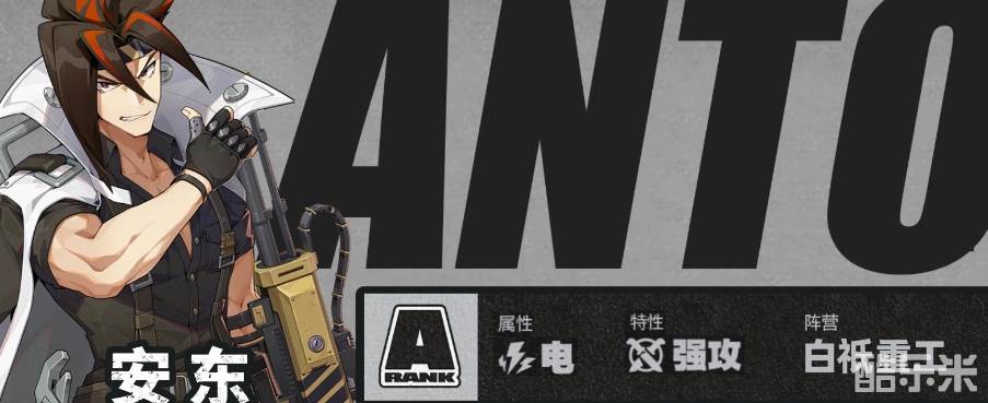 安东:电属性强攻角色,三名直伤A级主C的其中之一,开服时可以与格莉丝搭配,为队伍提供一定的直伤与电属性异常,现版本输出已经很不上,培养价值不高;实战时主要通过发动强化特殊技后进入【爆发状态】,之后蓄力普攻进行输出,此时电钻的攻击时间获得延长,并且每四次暴击就能触发一次感电伤害,兼具直伤与异常能力;