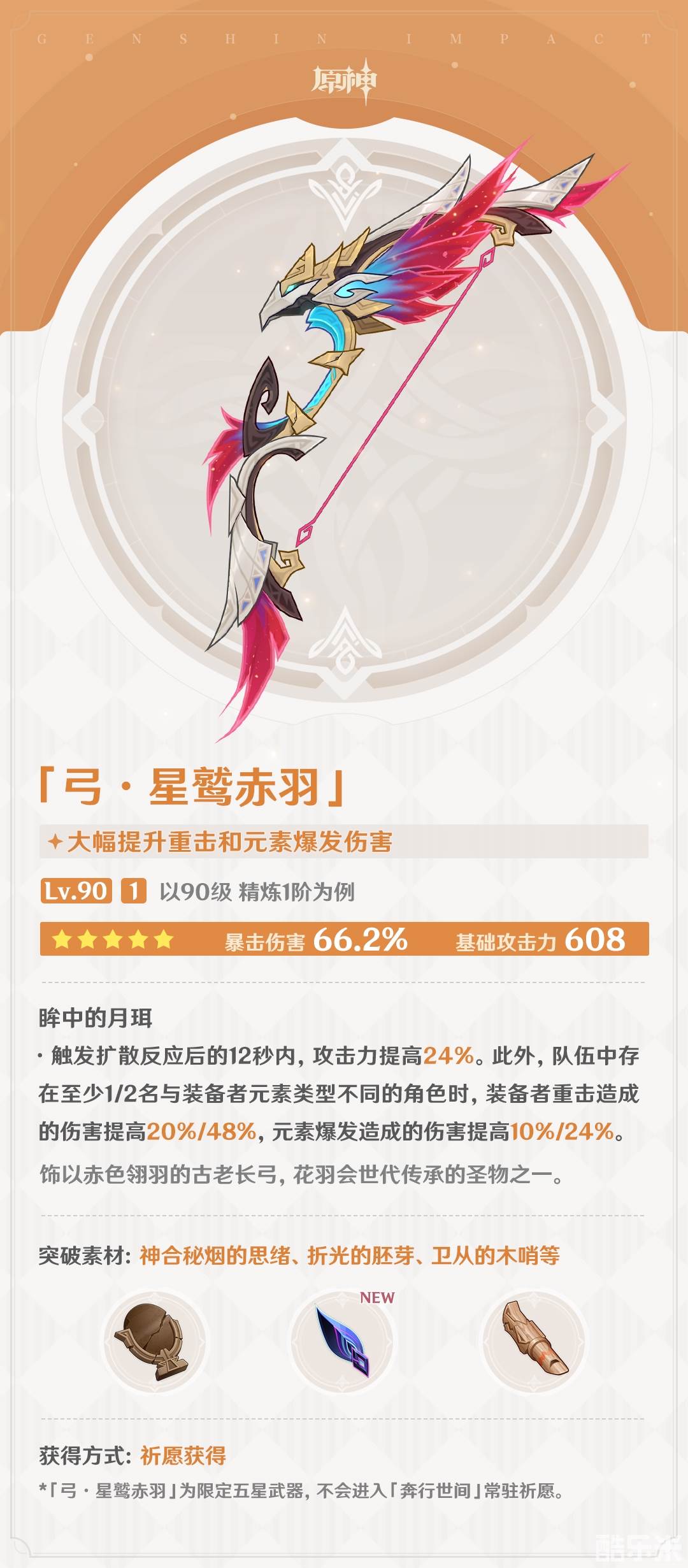 最近的前瞻直播中爆料纳塔是5.2版本中的全新武器,透露了武器的属性特效,突破材料等,那么有小伙伴好奇星鹫赤羽属性效果,下面和酷乐米小编一起来看看吧