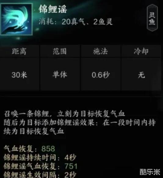4、锦鲤谣:消耗真气,召唤锦鲤立刻为目标恢复气血,并添加锦鲤之助效果,持续4秒为目标恢复气血