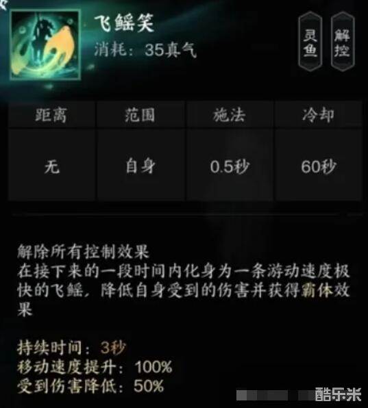 5、飞鳐笑:消耗真气,解除所有控制,接下来一段时间化身移动速度极快的飞鳐,降低自身伤害并获得霸体效果