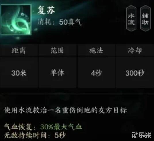7、复苏:消耗真气救治一名重伤倒地的队友并恢复他30%最大气血,无敌持续5秒钟
