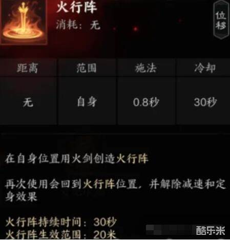 6、火行阵:位移技能,在当前位置创造火行阵,再次使用可回到火星阵位置