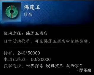 参加各种玩法、副本获得的代币,推荐每周刷满上限2w,可在佛莲玉商店中兑换趣味道具和数值养成道具。