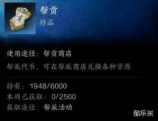 参加各个帮派玩法获得的代币,推荐每周刷满上限2500,可在帮贡商店中兑换趣味道具和数值养成道具。