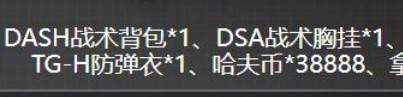 包含DASH战术背包、DSA战术胸挂、DAS防弹头盔、TG-H防弹衣、哈夫币(38888)、拿着花(喷漆)各一个1。