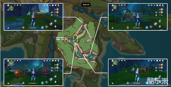 ◆奥奇卡纳塔北方向顶层传送锚点出发,沿着下图路线采集,所有采集点均在路两侧。