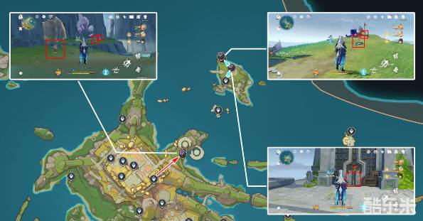 ◆从奥奇卡纳塔七天神像出发,前两处采集点位于空中走廊附近,其余采集点位于山脚下水边。