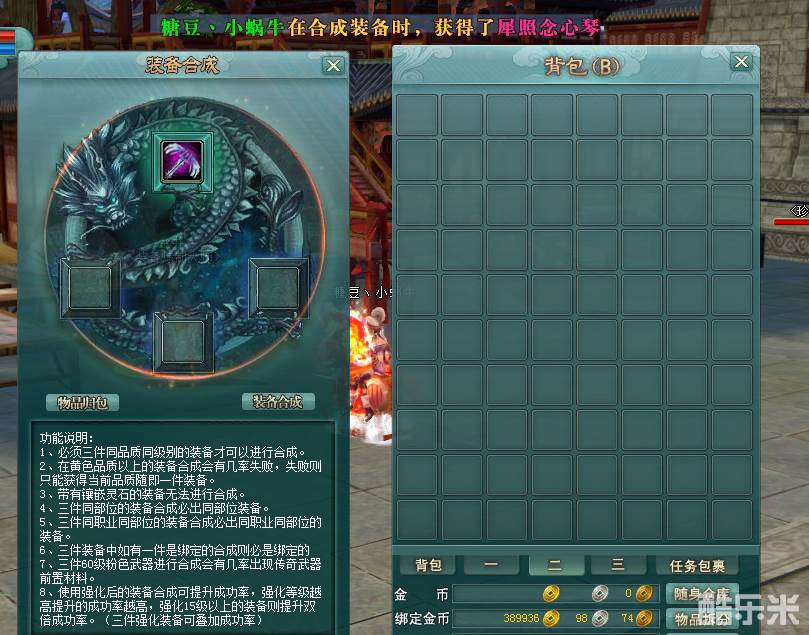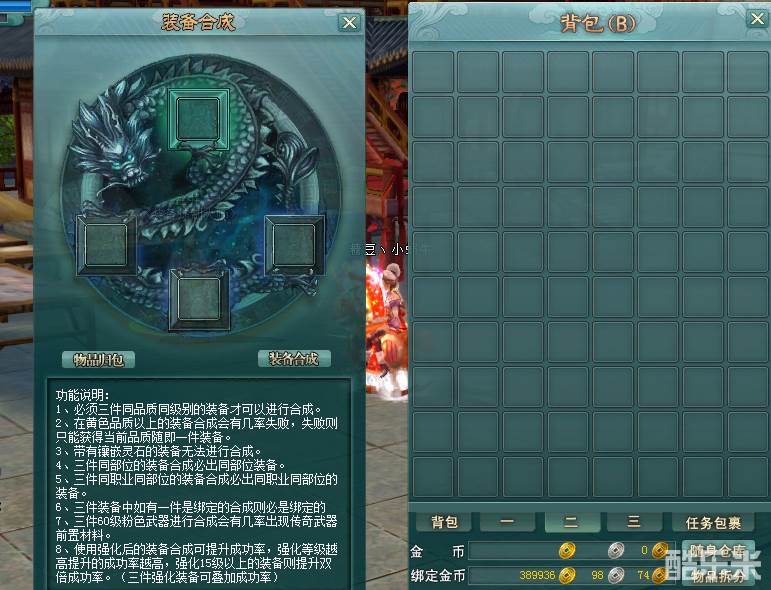 那么问题来了,在我们平时的游玩中,不论是任务还是副本中,每次背包里面都有大量的不符合自己职业的装备,我们除了拆分和出售商店还能有什么作用呢?那就是今天的重点,装备合成系统啦~ 装备合成系统是在江都“金井”处,点击金井找到装备合成,在装备合成栏里面就可以看到放入三件同等级同品质的装备后就可以随机合成一件同品质或者高品质的装备的哦~