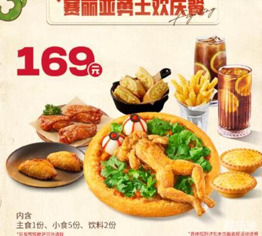 1、赛丽亚勇士欢庆餐售价169元,包含主食一份、小食五份、饮料两份;