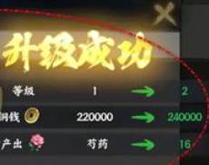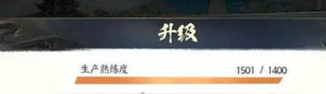 3、在升级页面,可以看到升级后的熟练度、等级、铜钱、新增产出等属性;