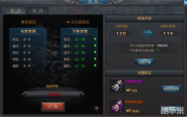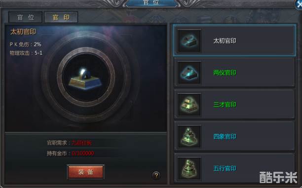 5.低阶官印徐要求一定数量的金币(非绑金),高阶官印去求的是元宝