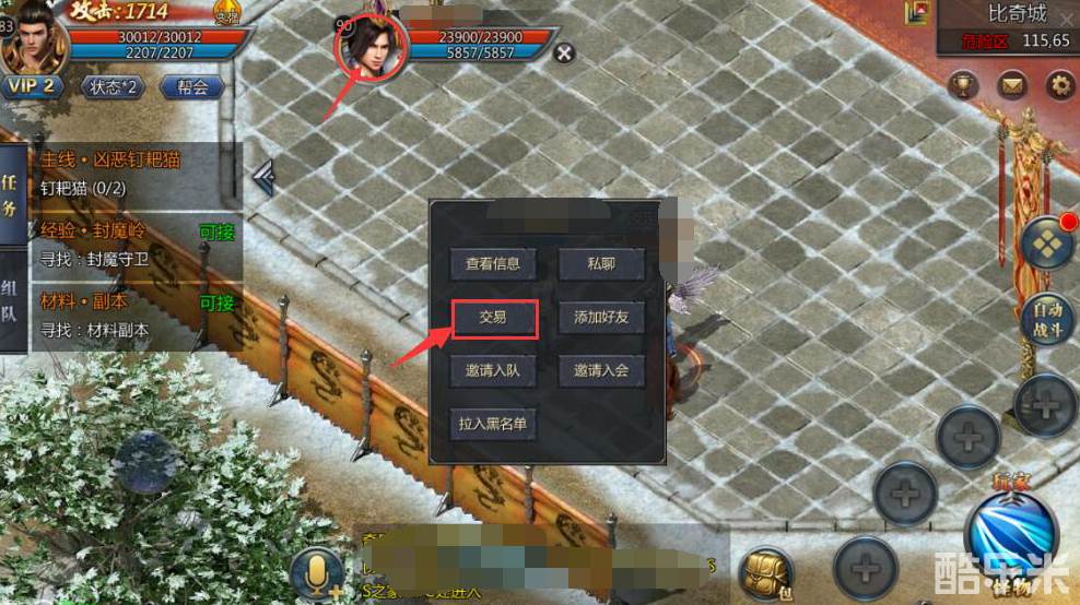 交易功能是必不可少的一项,需要交易道具的玩家之间,可以站在一块,通过点击对方角色选定,随机会在界面上方显示对方的人物头像,点击对方头像后,即可看到[交易]二字,继续点击。