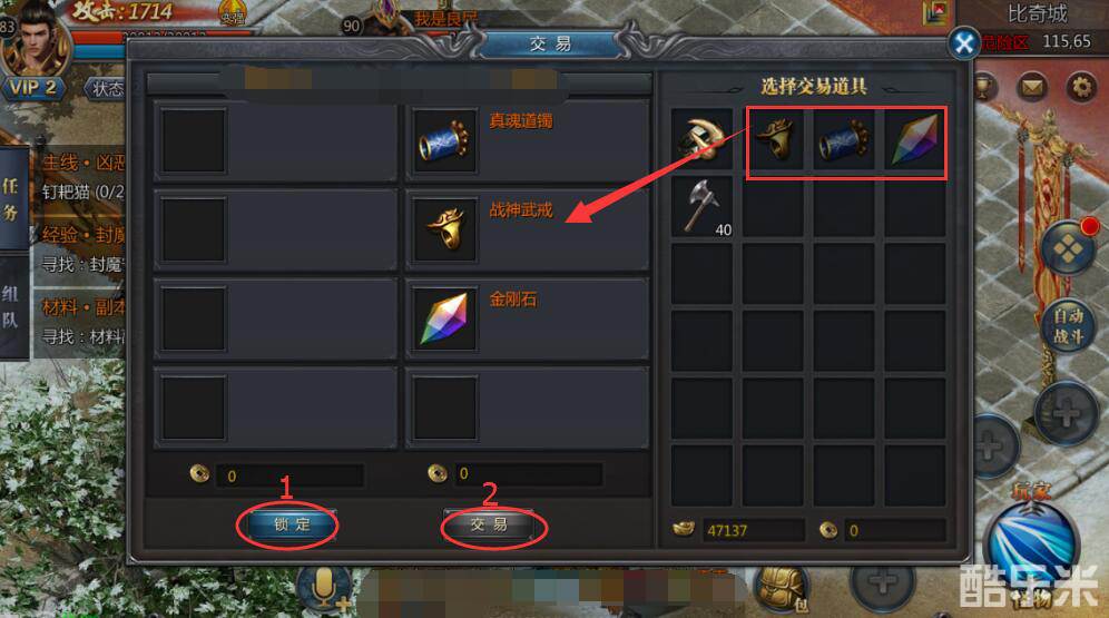交易双方可以互相选择自己背包里的非绑定的道具放入交易栏中,每次各自只能最多放四件道具,随后双方都需要点击指示标志:1锁定+2交易,才能成功交易。