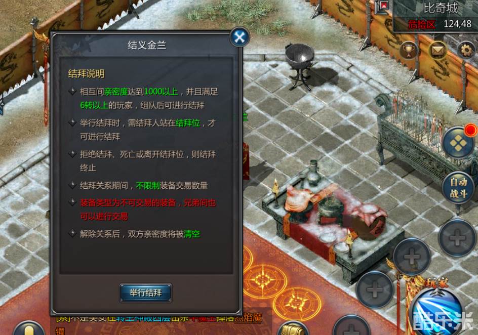 王者传奇游戏中除了拜师系统,还有义结金兰玩法,相互间亲密度达到1000以上,并且满足6转以上的玩家,组队后可进行结拜。举行结拜时,需结拜人站在结拜位,点击【结义金兰】NPC,选择举行结拜,才可以进行结拜。下面和酷乐米小编一起来看看吧