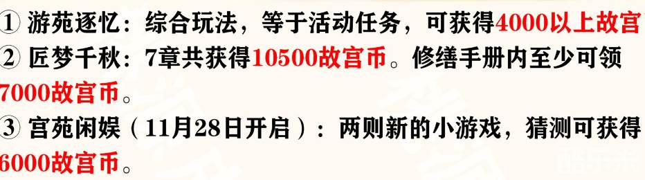 ① 游苑逐忆:综合玩法,等于活动任务,可获得4000以上故宫币。 修缮手册有7000故宫币。