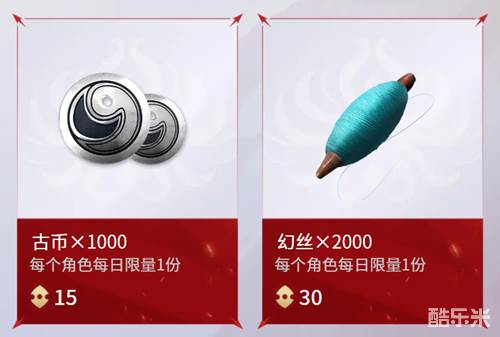3、古币*1000(每个角色每日限量1份):15积分;幻丝*2000(每个角色每日限1份):30积分;