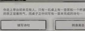 触发条件:在亭台中,你会看到一壶茶和一个杯盏,杯中茶正冒着热气,桌子中间写有一首未完成的诗句。此时,你可以选择填写诗句或者转身离去;