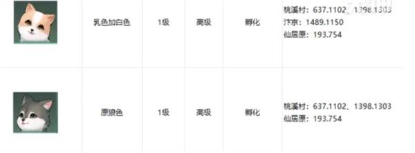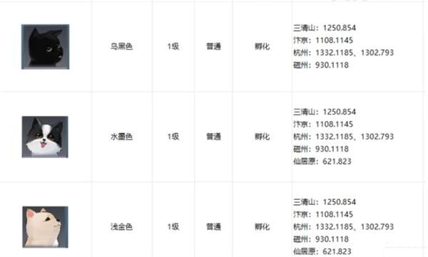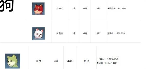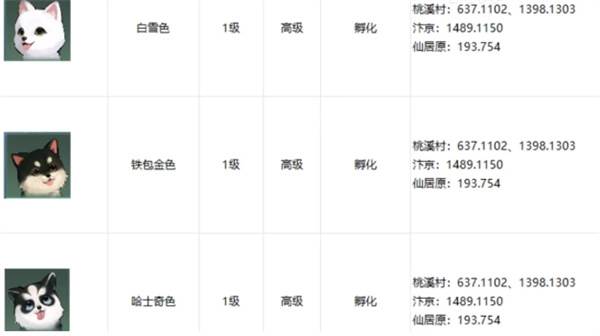 宠物捕捉位置:赤焰色宋辽边境:420.546;夕霞粉三清山:1250.854;若竹三清山:1250.854;杭州:1332.1185;