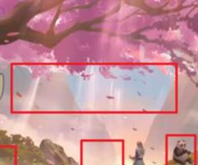 2、右侧最左边缺少熊猫以及中间的动物、最右侧的动物错误、上方的缺少粉色的云。