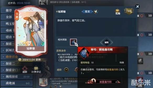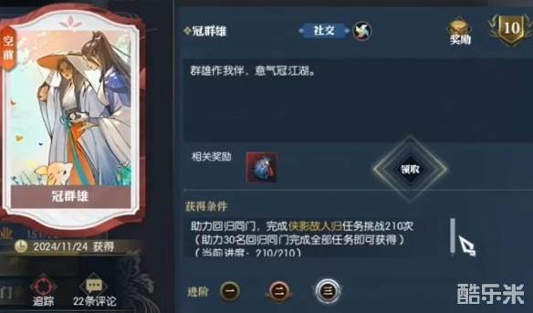 说英雄卡冠群雄是一个空前品质的成就,很多小伙伴想知道说英雄卡冠群雄怎么获得,玩家需要助力回归号去完成任务【侠影故人归】,助力30个回归号完成210次任务即可获得,接下来酷乐米小编给大家带来了详细的《逆水寒手游》说英雄卡冠群雄获得方法。