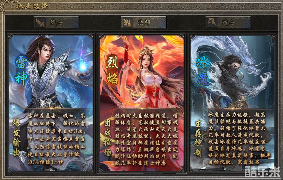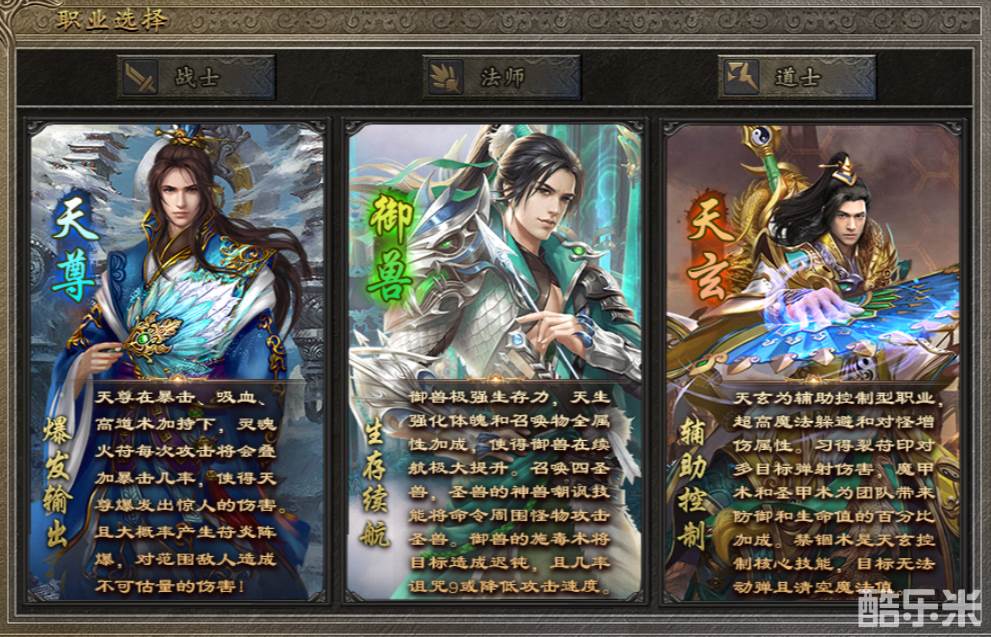 首先,《古味传奇》在复古三职业的版本上做了玩法延展,为每一个职业设计了三种进化方向。战士可以变成战圣、战狂、武宗三个职业,法师可以变成雷神、烈焰、冰魔三个职业,道士则可以变成天尊、御兽、天玄三个职业。我们都知道,在原版的传奇游戏里,三种职业各有强势之处,但短板也很明显,如果单打独斗都可能被掐着脖子打,所以一个靠谱的团队行会是刚需。而分化成《古味传奇》的九种职业后,等于是将强势之处进一步深化,来弥补短板的不足,使每一个职业都有特立独行的资本,这样才能在小规模竞技中体现出玩家的手法和配合。