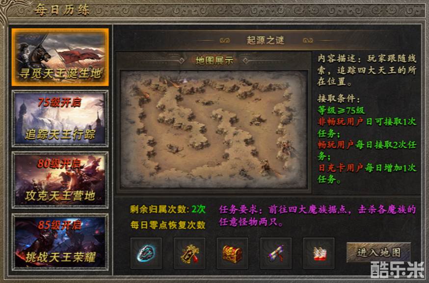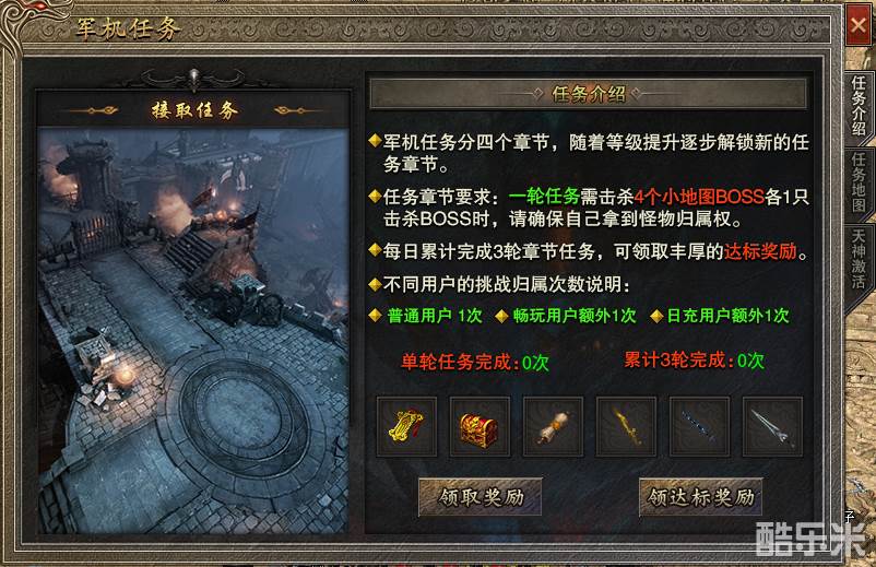 除了系统安排的剧情路线外,《古味传奇》中还有日常的挑战任务、军机任务等玩法,每天几分钟完成击杀怪物、解谜寻宝的任务就能领取大量奖励。对那些熟悉传奇地图的老玩家来说,军机任务这种跑地图刷boss的活动可谓是挠到痒处的福利,尤其是御兽流道士,简直是去了就打,拿了就走。如果运气爆棚,随机刷到的天神套装还能激活更多套装属性。