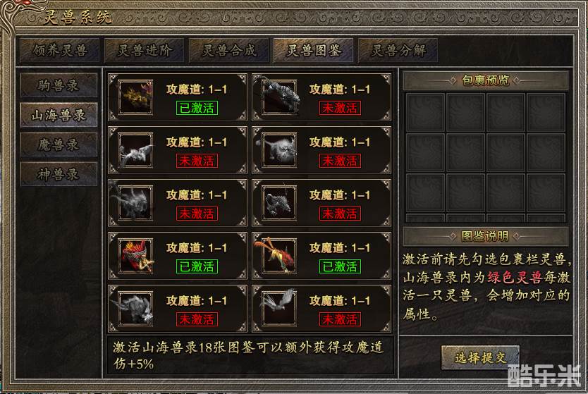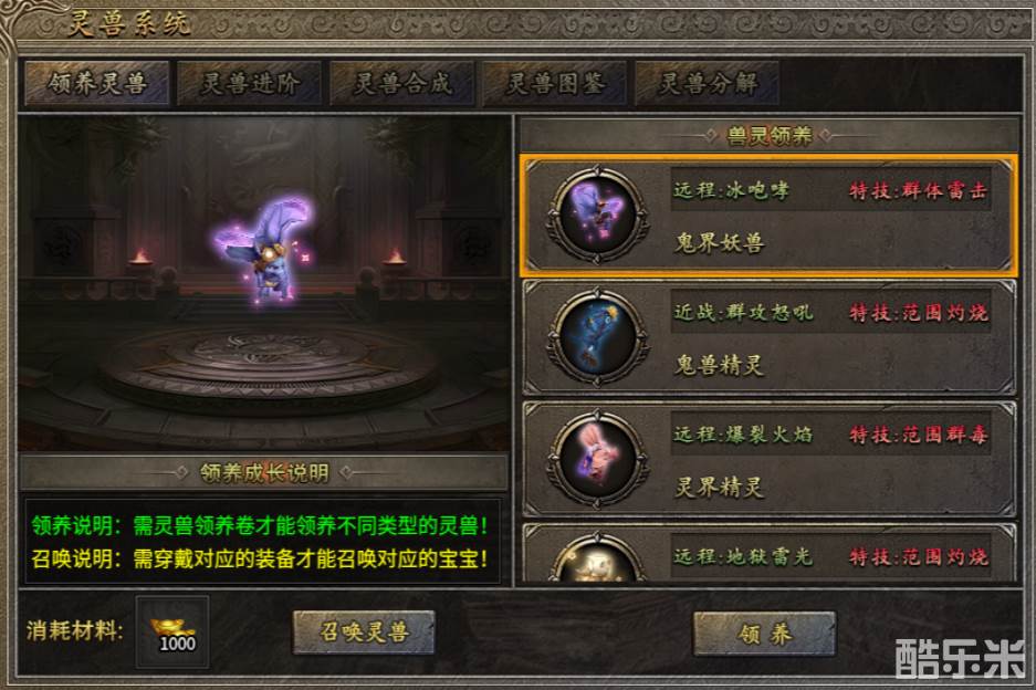 游戏中还有灵兽领养系统,在驹兽、山海兽、魔兽、神兽四类中自由选择,领养后通过进阶、合成和分解让灵兽逐步发育到绿色、紫色和更高阶的橙色阶段,大幅度地提升玩家自身的属性,如虎添翼。如果拿到不需要的灵兽也不要扔掉,提交到灵兽图鉴里,攒起来也能激活特定人物属性,悄悄收集悄悄成长,惊艳所有人。