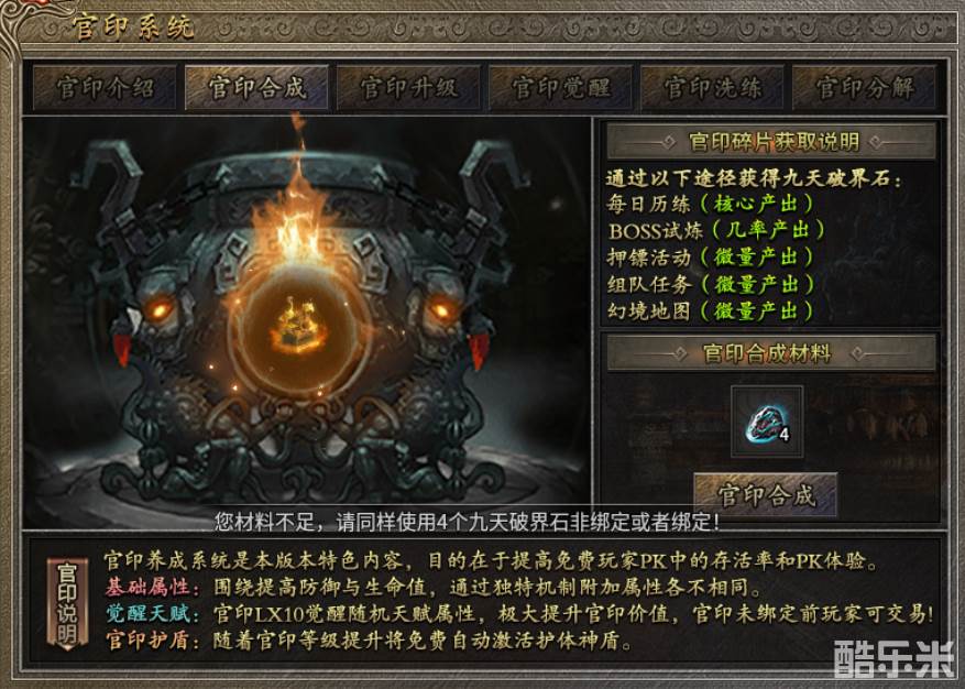 另一个特色系统就是“官印”,在刷怪的过程中能够获得九天破界石,将它合成初阶官印后进行升级、觉醒、洗练,官印属性提升,玩家在PVP中的存活率也会大幅度提升,难怪有的玩家说考公上岸了就是不一样。