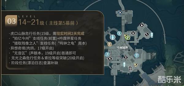 主线第四幕完结、第五、六幕在21级开启,中间还有20级突破索拉等级一道门槛,战线开始拉长、这个区间开始有一些自由时间去探索,有几个经验较多的点可以供漂泊者优先选择拿经验。