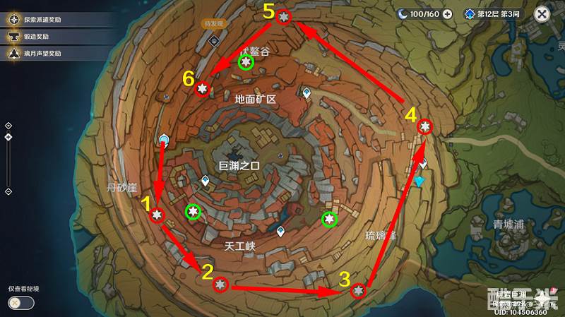 1、沐宁的任务叫做藏石者言,就是收集石头,首先到丹砂崖的锚点,然后如图绘制的路线,飞过断崖,一路朝下走,看到一群丘丘人,获取第一颗老石。