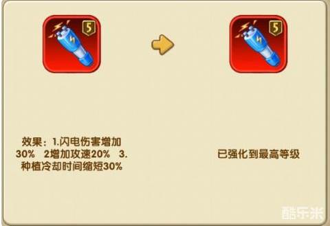 lv5:闪电伤害+30%,攻速+20%,种植冷却-30%