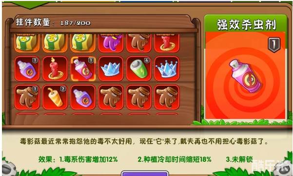 植物大战僵尸2强效杀虫剂适合哪个植物使用,目前能用到这个挂件的就是无尽药师,可以加快毒杀速度,虽然这样这样,但还是属于鸡肋中的鸡肋,不太推荐购买,下面和酷乐米小编一起来看看吧