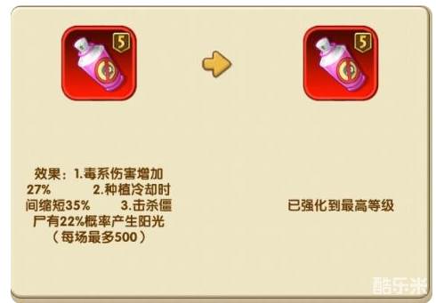 lv5: 毒系伤害+27%, 种植冷却-35%, 阳光概率 22%(每场最多 500)