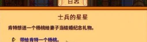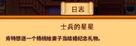 士兵的星星这个剧情主线任务怎么完成呢?在第二年夏季的第15天信箱内,会收到这个任务的,和肯特互动后得知他们的结婚纪念日即将来临,他想给妻子一个杨桃作为惊喜,我们需要给NPC一个杨桃来完成任务,为了帮助大家快速完成任务,下面和酷乐米小编一起来看看吧