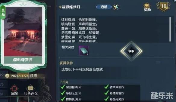 疏影蝶梦归是新出的卡牌,很多小伙伴想知道说英雄卡疏影蝶梦归怎么获得,玩家在在千月戏院游览并完成8个子任务即可达成说英雄卡【疏影蝶梦归】,接下来酷乐米小编给大家带来了详细的《逆水寒手游》说英雄卡疏影蝶梦归获得方法!