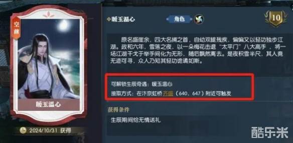 暖玉温心是赛季服无情的生辰奇遇,那么逆水寒暖玉温心怎么完成呢,先送礼物触发卡片,然后去汴京虹桥【齐盛】(640.647)附近触发该奇遇,接下来酷乐米小编给大家带来了详细的《逆水寒手游》无情生辰奇遇暖玉温心攻略!