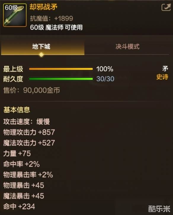 却邪战矛是《地下城与勇士:起源》中的魔法师职业60级史诗矛,有着大幅增加伤害的效果,以及一定暴击加成的基础属性,接下来酷乐米小编给大家带来了详细的《地下城与勇士:起源》却邪战矛属性一览,大家一起来看看吧!