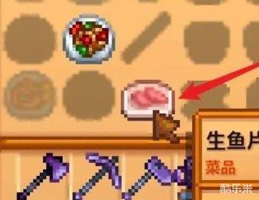 生鱼片是星露谷游戏内的食谱,生鱼片的制作原料只需要鱼类即可,选择食谱消耗鱼类进行烹饪即可获得生鱼片了,想要制作这个食谱,准备工作不能少,下面和酷乐米小编一起来看看吧