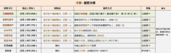 探索大师卡片完成后可获得古道西风时装,很多玩家都想知道探索大师怎么获得,完成以下9个位置的探索即可获得卡片【探索大师】,探索花的时间比较长,建议先买好药用的道具风车*3和糖葫芦*3.下面和酷乐米小编一起来看看吧