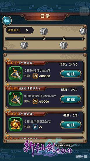 相信很多仙迷在游戏中都会遇到装备升级没八仙石、卡牌技能提升没狗粮(白、绿卡等只能拿来提升卡牌技能的低级卡)、御灵升级没金蛊的尴尬境地吧?其实大家都没有注意到,在新版本中完成每日成就里的一些目标,系统不仅会奖励大量的铜币或材料道具给玩家,更有可能得到实打实的元宝奖励!只要搭配得当,福利拿到你手软,根本不担心没道具可用。如消耗掉30张卡牌提升技能就可以获得5W铜币,强化装备10次可以获得5个体力药剂,在副本中参加PVP对战道具3次可以获得10个金蚕,挑战3次门派BOSS可以获得10W铜币,而且还会有宝箱等等。