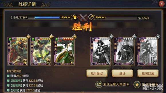 可以看出,这支队伍只有两个五星战法:【胜兵求战】与【千里疾行】,基本不会被占用。另外两个四星战法【奔袭】和【雀伏】,也比较容易获得。除了蜀关羽和步诸葛亮的自带战法以外,其他战法都是高几率的瞬间输出战法,所以输出不是问题。而蜀关羽和弓诸葛亮可以封印对方的主动战法,使得队伍的生存能力大大提高,也克制了以都督队为代表的依靠主动战法的队伍。